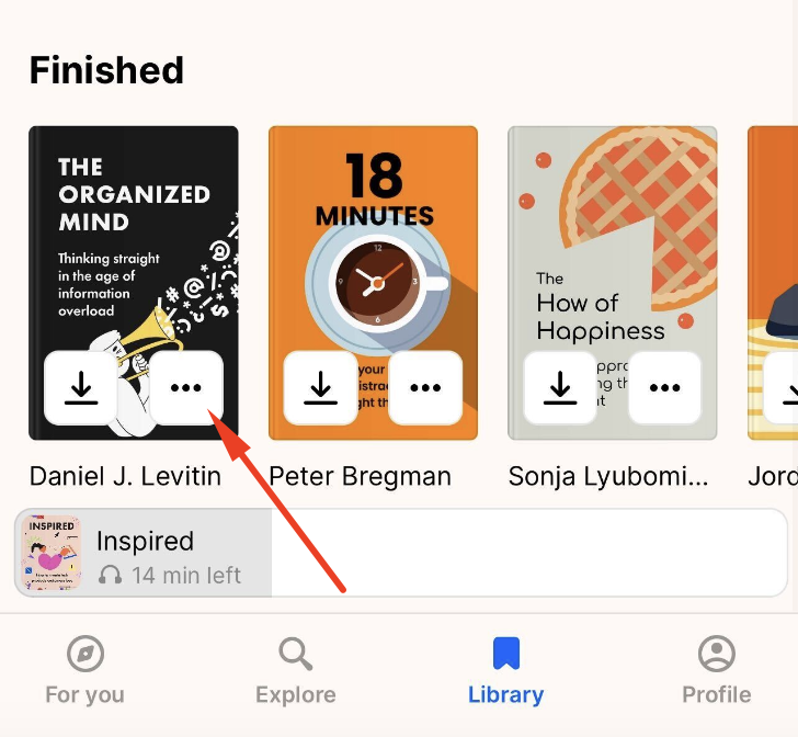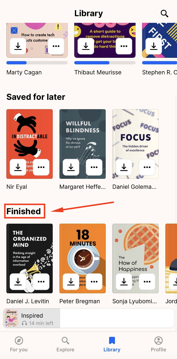 To find a summary you have already read, go to the Library page. In the Summaries tab, scroll down a bit to find the Finished section: